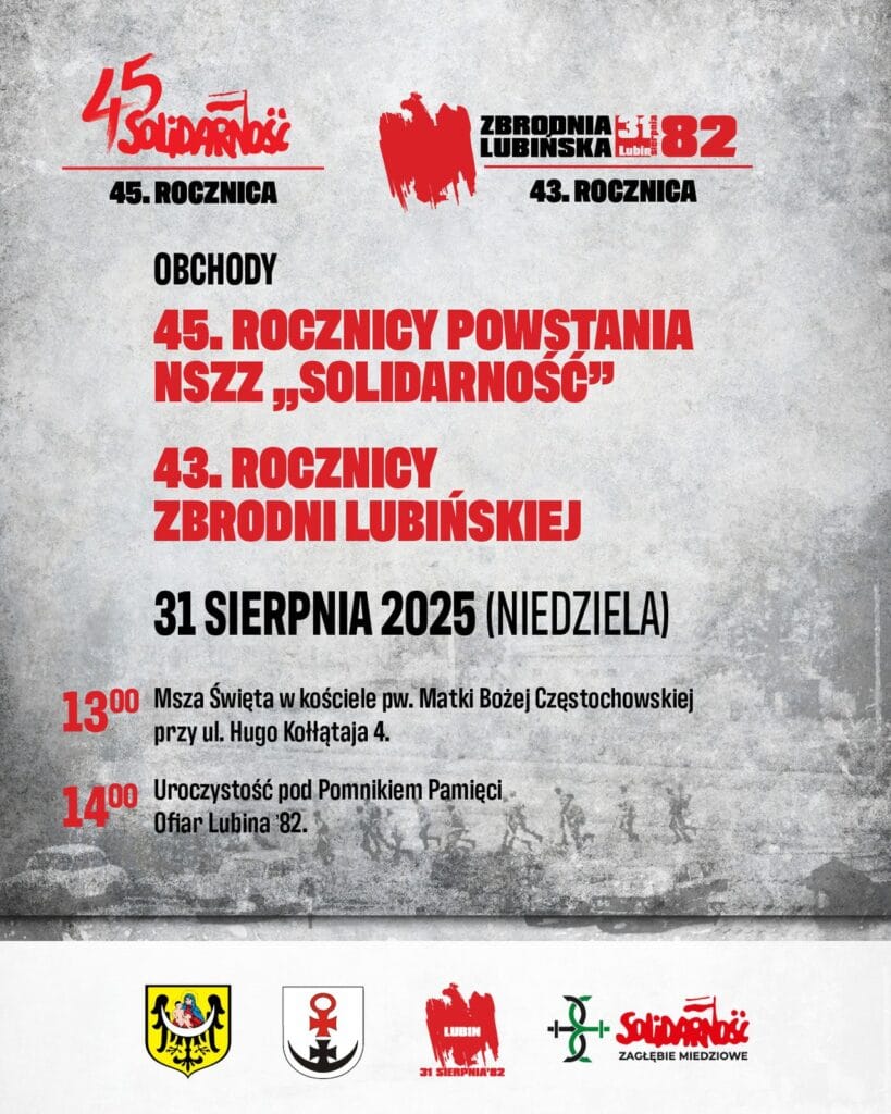 W tym roku obchodzimy 45. rocznicę powstania NSZZ „Solidarność” oraz 43. rocznicę „Zbrodni Lubińskiej”, kiedy z rąk komunistycznych oprawców zginęło trzech robotników – Michał Adamowicz, Mieczysław Poźniak i Andrzej Trajkowski – uczestniczących w pokojowej manifestacji na ulicach Lubina, a wielu zostało rannych.